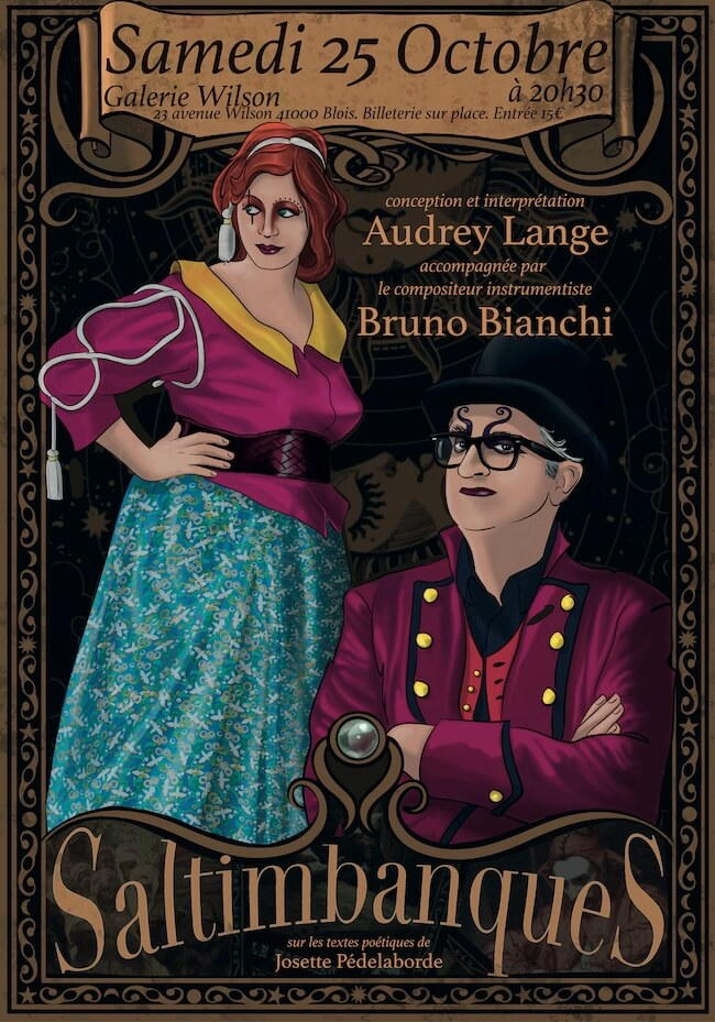 Conçu et interprété par Audrey Lange, accompagnée du musicien Bruno Bianchi, Saltimbanques propose une expérience interactive mêlant théâtre et musique. Inspirée des textes de Josette Pédelaborde, la comédienne incarne divers portraits tirés au hasard d’un jeu de cartes, chaque personnage laissant un message ou un présage au public. Un spectacle tour à tour drôle, émouvant et dépaysant, où la frontière entre artiste et spectateur s’efface.