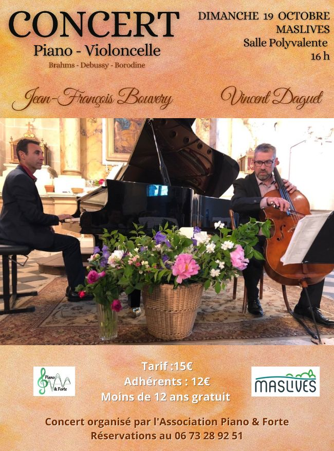 Jean-François Bouvery (piano) et Vincent Daguet (violoncelle) interprètent quelques-unes des plus belles pages du répertoire pour piano et violoncelle. Un programme riche en émotions avec des œuvres de Borodine, Debussy et Brahms, porté par deux musiciens passionnés. Concert organisé par l’Association Piano & Forte, en partenariat avec la commune de Maslives. Réservations : 06 73 28 92 51.