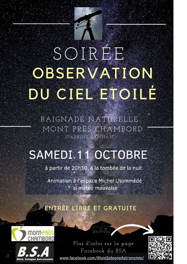 Observation du ciel nocturne avec Blois Sologne Astronomie, à la tombée de la nuit. En cas de météo défavorable, repli à l’espace Michel Lhommédé. Une invitation à découvrir les étoiles et la magie du ciel, dans le cadre de l’événement national « Le Jour de la Nuit ».