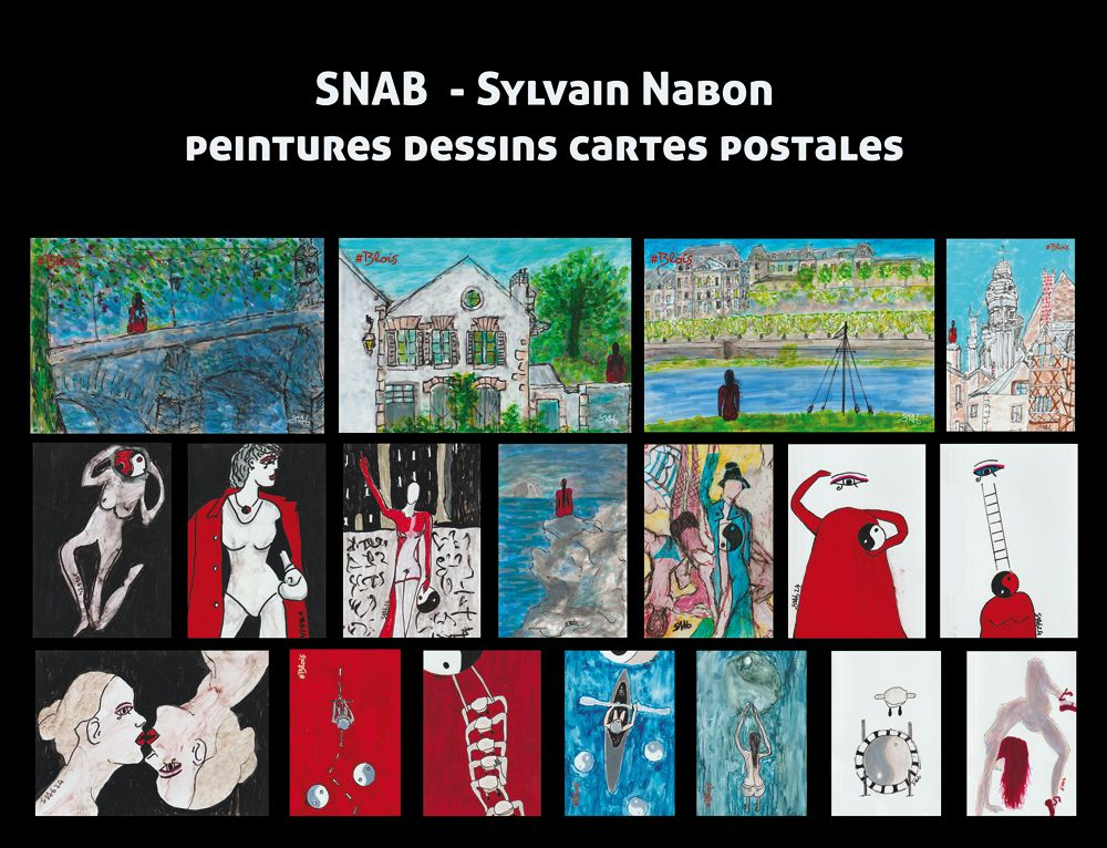 Snab (Sylvain Nahon) présente une exposition d’art contemporain mêlant peintures, dessins et cartes postales autour des thèmes du yin et yang et de croquis de Loire.