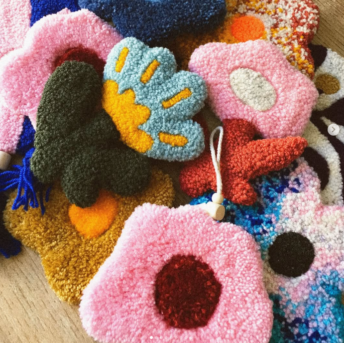 Alicia Léon aime explorer, tester, s’aventurer dans de nouveaux champs créatifs. C’est ainsi qu’elle s’est tournée vers le tufting — une manière de « sortir du papier », de créer tapis et suspensions murales. « Je trouvais ça trop chouette quand je voyais les autres faire ça », raconte-t-elle. Cela fait désormais deux ans qu’elle développe cette pratique, passant de petits formats à de grandes pièces, contraintes seulement par l’espace de son appartement. Elle expérimente aussi le collage, s’essaie au vitrail, participe à des ateliers pour alimenter sa curiosité. « C’est comme ça qu’on se nourrit et qu’on développe après nos propres visuels, notre propre art », dit-elle.