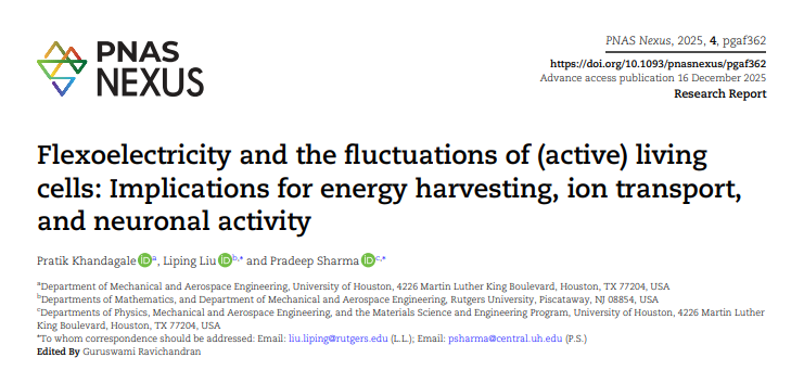 Khandagale P., Liu L., Sharma P., Flexoelectricity and the fluctuations of (active) living cells: Implications for energy harvesting, ion transport, and neuronal activity, PNAS Nexus, 2025