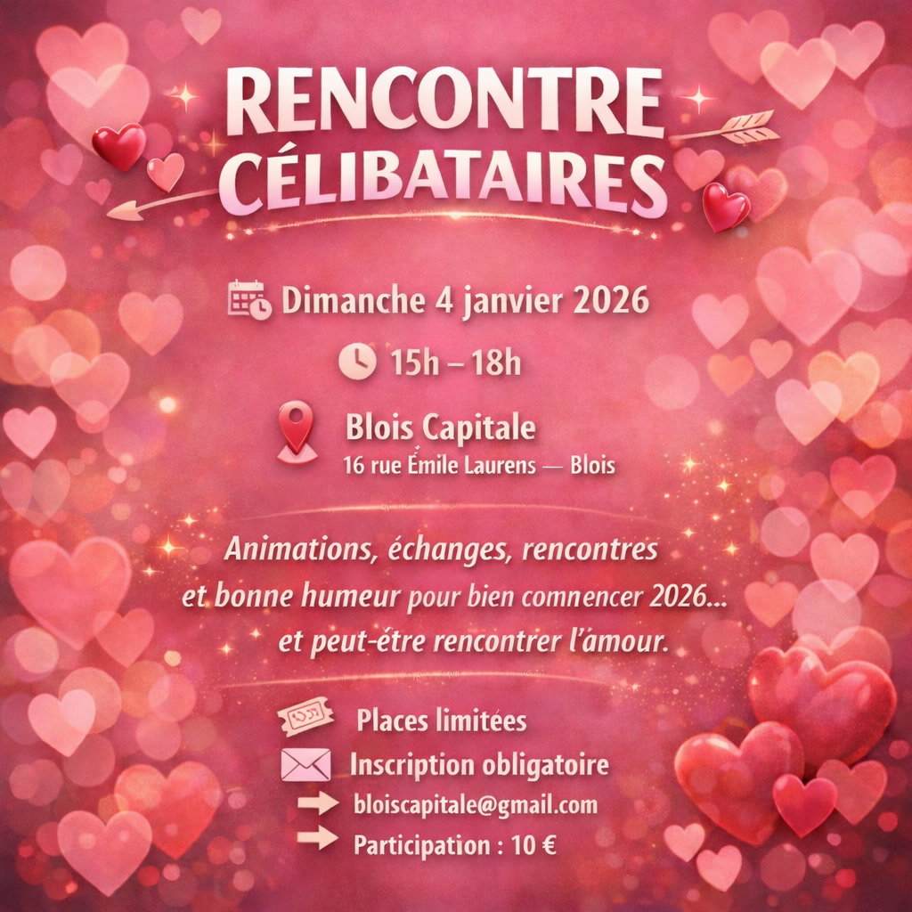 C’est pourquoi, après deux soirées de rencontres entre célibataires qui ont bien fonctionné dans notre boutique située au 16 rue Emile Laurens, nous essayons un dimanche après-midi ! En l’occurrence le 4 janvier 2026. Avec toujours des animations, et de la convivialité. De 15h à 18h, trois heures de partage complice pour bien débuter 2026 et potentiellement rencontrer l’amour. Les places sont limitées : il faut donc s’inscrire via bloiscapitale@gmail.com ou à la boutique. Participation demandée : 10€.