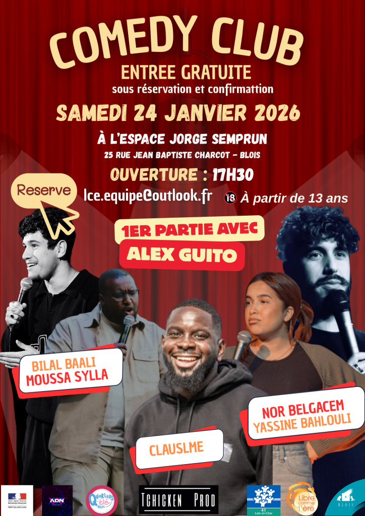 Soirée comedy club avec plusieurs humoristes sur scène, pour un moment placé sous le signe du rire et de la convivialité. La première partie sera assurée par Alex Guito, suivie des passages de Bilal Baali, Moussa Sylla, Clauslme, Nor Belgacem et Yassine Bahlouli.