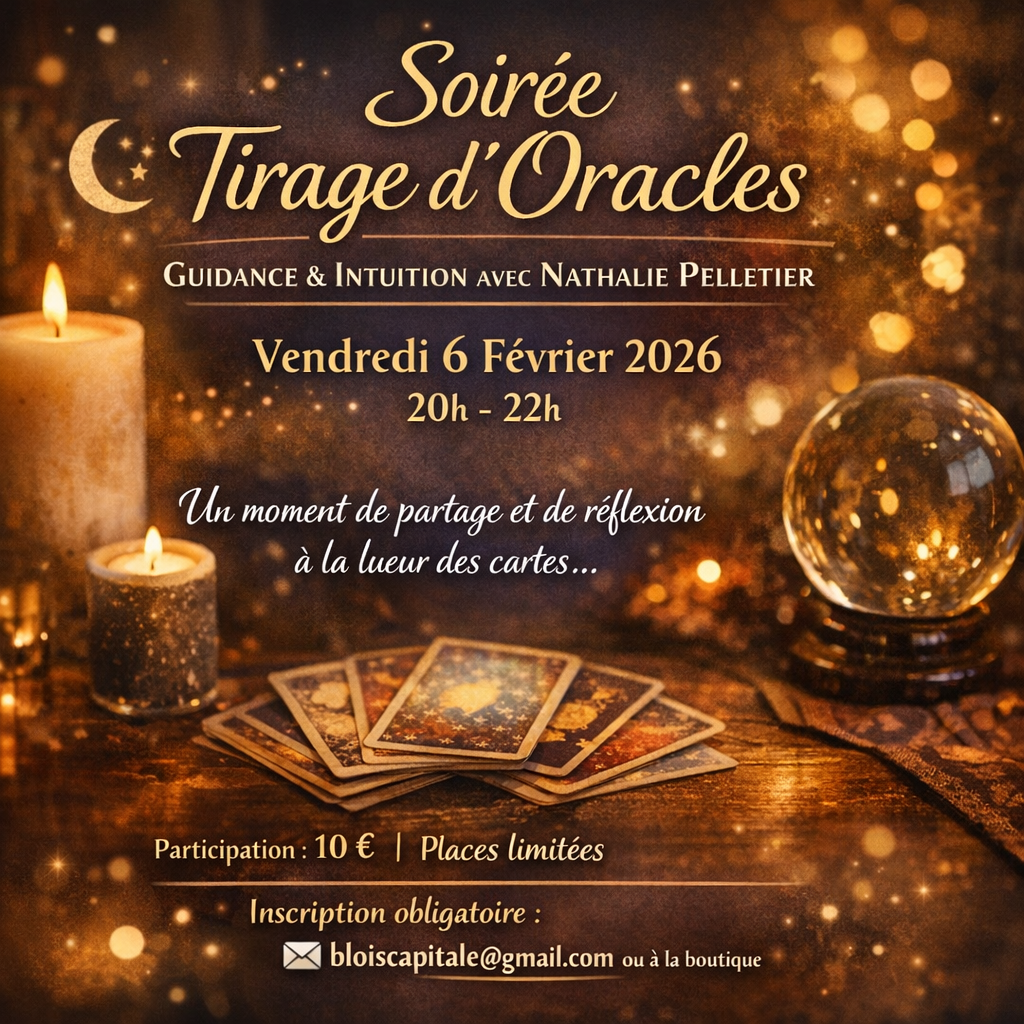 Le temps d’une soirée, la boutique Blois Capitale ouvre un espace à part, propice à l’écoute, à l’intuition et aux messages symboliques. Aux côtés de Nathalie Pelletier, praticienne sensible et intuitive, les participant·es sont invité·es à découvrir le tirage d’oracles comme un outil de guidance, de réflexion et de mise en lumière.